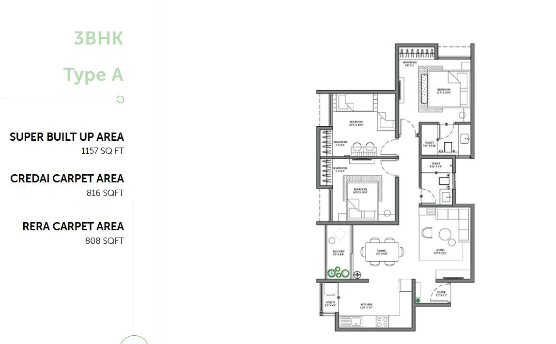 - Super built-up Area: 1157 sq. ft.